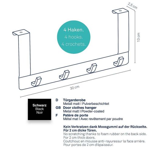 Dveřní věšák 4 háčky Colgar kovový černý 30,0x13,0x2,5cm KL-22241