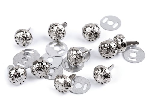 Dvounožkové hřeby s ozdobnou filigránovou hlavičkou využijete jako ochranu dna kabelky, tašky nebo batohu, ale i jako ozdobu (kabelek, tašek, opasků apod.). Hřeb připevníte jednoduše, stačí ho jen vložit do otvoru, přes nožky navléct plíšek a obě nožky hřebu rozevřít do stran. Jedna sada obsahuje 1 hřeb a 1 plíšek. Rozměry č. 1: - délka hřebu: 17 mm - průměr hlavičky: 10 mm - průměr plíšku: 13 mm