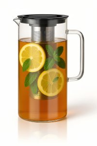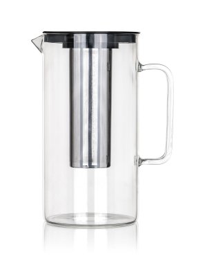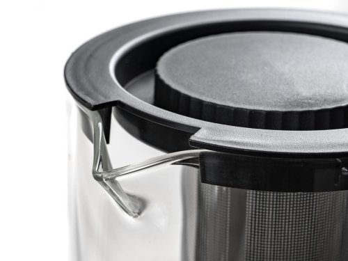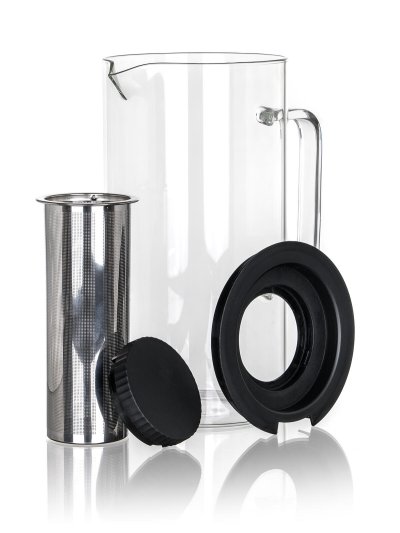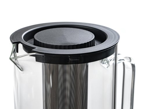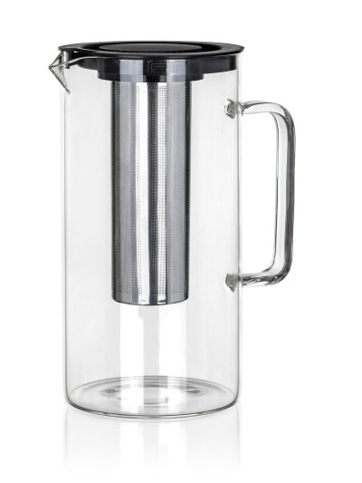 Skleněný džbán s plastovým víčkem a nerezovým sítkem je vhodný k podávání studených i teplých nápojů.