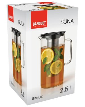 Džbán skleněný SUNA 2500m,l PH víčko, nerez sítko objem: 2500 ml materiál: sklo, plastové víčko, nerezové sítko Skleněný džbán s plastovým víčkem a nerezovým sítkem je vhodný k podávání studených i teplých …