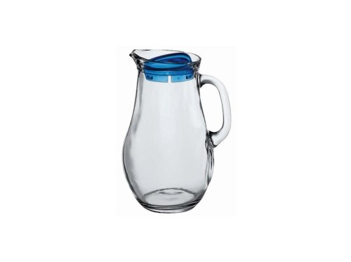 Skleněný džbán s plastovým víkem bez dekoru. Průměr 11 a výška 24 cm, objem 1850 ml. Mix barev víka dle skladové dostupnosti červená a modrá. Vyrobeno z běžného stolního skla. EAN 8693357148772