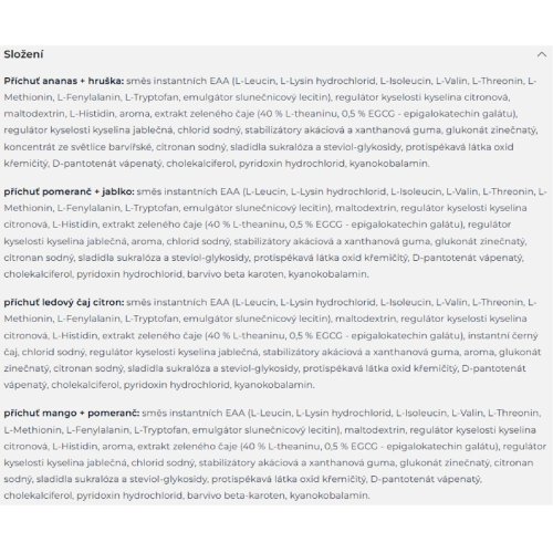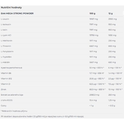 9 esenciálních aminokyselin v instantní formě, doplněné o vitaminy, zinek a extrakt ze zeleného čaje. Směs je speciálně navržená pro podporu optimální činnosti svalů, nervové soustavy a snížení vyčerpání při tréninku. Nezbytné aminokyseliny si naše tělo nedokáže samo vytvořit, a proto je důležité je přijímat ze stravy či doplňků. Přirozeně je najdete například v mase, mléčných výrobcích nebo vejci. Elixírem života je již po mnoho let nazýván extrakt ze zeleného čaje. V lidovém léčitelství je vyhledáván pro fyzické a psychické povzbuzení, či podporu koncentrace. Zinek přispívá k normální funkci imunitního systému, syntéze bílkovin a udržení normálních kostí. Podporuje činnost reprodukčního systému, s oblibou je vyhledávaný pro udržení normálních vlasů, nehtů a pokožky. Doporučené dávkování: Rozmíchejte 12 g (cca 1/3 odměrky)v 350 ml vody a po minutě můžete konzumovat. Nápoj vypijte maximálně jednou denně před tréninkem. Nepřekračujte doporučené dávkování. Po namíchání jsou v nápoji patrny nerozpuštěné částice, což je přirozenou vlastností výrobku. Upozornění: Doplněk stravy, se sladidly. Nenahrazuje pestrou stravu. Není určeno pro děti, těhotné a kojící ženy. Neužívat nalačno. Konzumace s jinými výrobky obsahující zelený čaj by neměla přesáhnout 800 mg EGCG za den. Ukládejte mimo dosah dětí. Chraňte před teplem, mrazem a vlhkostí. Dodavatel: NUTREND D.S., a.s., Chválkovice 604, 779 00 Olomouc, Česká republika