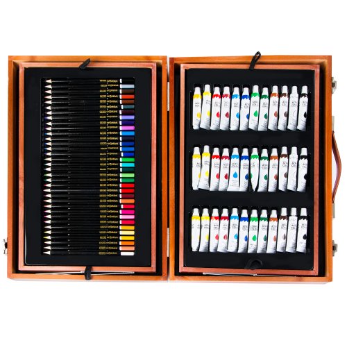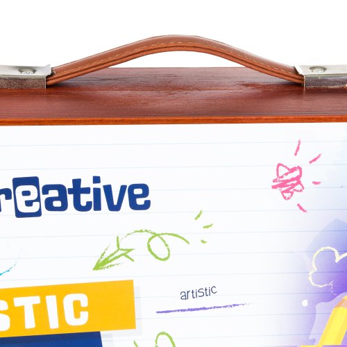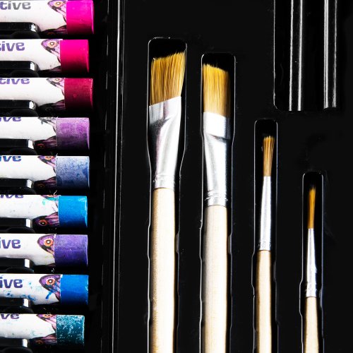 - Barevná paleta: 36 akrylových barev v tubě pro malování na plátno i papír, 34 klasických pastelek a 54 voskových pastelů v zářivých barvách.