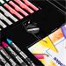 - Pro každou techniku: 17 mini pastelek a 24 fixů pro detailní kresby, 18 mini fixů pro jemné linky a 4 štětce pro malování s akvarely.