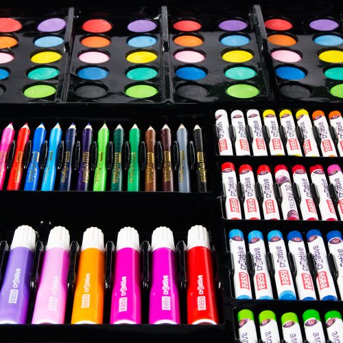 - Barevná exploze: 48 zářivých vodových barev, 55 olejových pastelů, 24 voskovek a 32 kříd pro malování na chodník i papír.