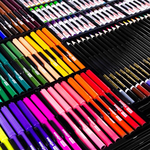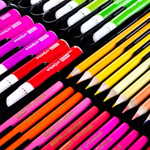 - Ohromující množství pomůcek: 48 jumbo fixů a 48 klasických fixů pro výrazné kresby, 72 pastelek pro detailní práci a 60 olejových pastelů pro jemné stínování.