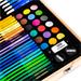 - Vodové barvy a další: 18 vodových barev pro akvarelové malby, 3 tužky pro skicování, 3 štětce různých velikostí, 2 gumy a 2 ořezávátka.