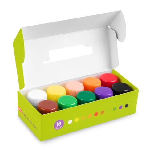 Sada obsahuje 10 kelímků s pestrými barvami, které se snadno roztírají a zaručují krásné a syté odstíny. Díky husté konzistenci a vysoké kvalitě pigmentů barvy skvěle kryjí a vaše děti si s nimi užijí spoustu zábavy.