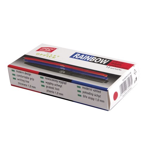 U propisky EASY RAINBOW se nachází speciální náplň se semi-gelovou konzistencí v červené barvě. Tato náplň zajišťuje pohodlné vedení propisky po papíru při zachování parametrů běžné náplně. Pevná koncovka umožňuje vedení precizní čáry o tloušťce 1 mm.