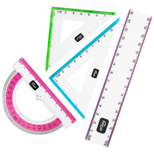 Hledáte praktickou a stylovou sadu pravítek pro geometrii? Sada EASY 4 v 1 obsahuje vše, co váš školák potřebuje pro rýsování a měření: pravítko (15 cm), úhloměr (180°) a dva trojúhelníky (45° a 60°).