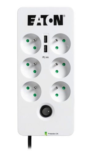 Praktická přepěťová ochrana pro počítače a elektroniku nabízí šest zásuvek a dva nabíjecí USB porty s výstupním proudem až 2,4 A.