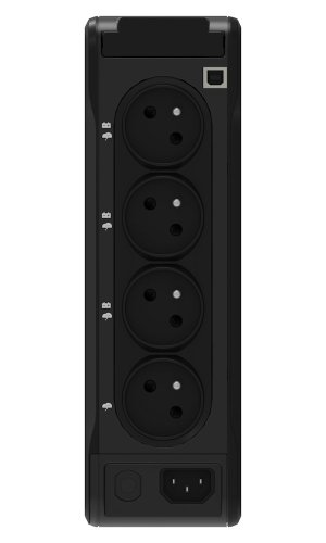Zdroj je vybaven 3 zásuvkami s ochranou proti přepětí a záložním napájením a 1 zásuvkou pouze s ochranou proti přepětí ve francouzském standardu (FR). Díky elegantnímu a kompaktnímu designu se zdroj hodí do jakéhokoliv prostředí - můžete jej umístit horizontálně, vertikálně nebo s volitelným příslušenstvím i na stěnu či do racku.