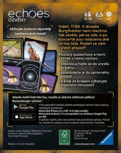 Echoes Housle - tajemná audiohra Vídeň, 1788. V divadle Burgtheater není všechno tak skvělé, jak se zdá, a po koncertě jsou nalezena dvě mrtvá těla. Podaří se vám vyřešit tento tajemný případ? Echoes, to jsou napínavé detektivní audiohry pro celou rodinu i partu přátel. Jak dobře dokážete naslouchat zvukům ve svém okolí? Ve hře echoes vyšetřujete záhady za použití svých speciálních schopností. Až budete zkoumat jednotlivé předměty, uslyšíte ozvěny z minulosti – tajemné zvuky a hlasy, které vám umožní odhalit tajnou historii předmětů a seřadit události do správného pořadí. Aktivujte zvukové nápovědy naskenováním karet. Poslouchejte zvuky a dialogy, které jsou propojené s herním materiálem. Najděte při poslechu všechny indicie, poskládejte je do správného pořadí a vyřešte záhadu. Ke hře je nutné stáhnout zdarma aplikaci Ravensburger echoes, která je kompletně namluvená v češtině – vypravěč Václav Neužil.