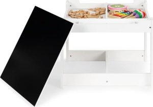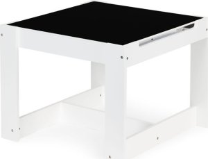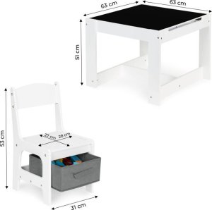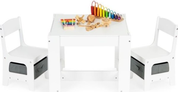 stabilní dřevěná konstrukce je doplněna o MDF desku, která se snadno udržuje, sestavu doplňují dvě stabilní a pohodlné židle, stůl má odnímatelnou horní část a lze jej použít i jako tabuli, pod deskou stolu jsou funkční přihrádky pro uložení kostek, hraček nebo jiných drobností, v prostoru pod deskou stolu je i role papíru, na kterou může dítě kreslit nebo malovat, pod sedákem židlí jsou prostorné, textilní zásuvky, ideální pro uložení hraček, jednoduchý design ve skandinávském stylu.