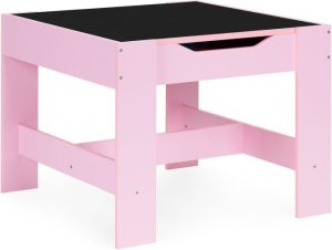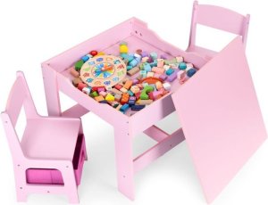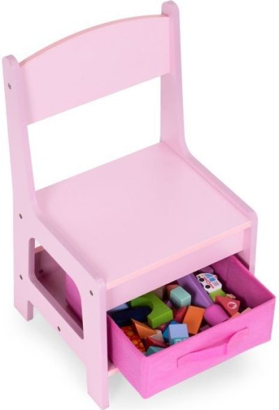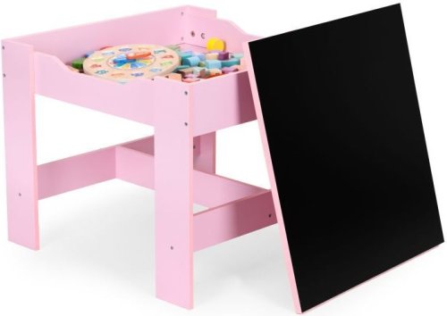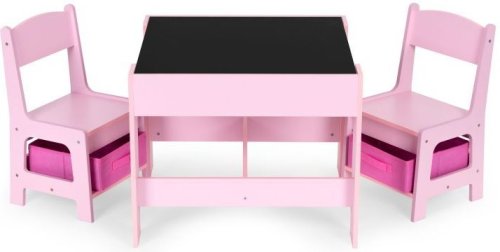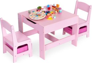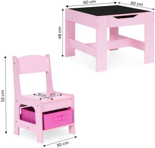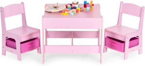 stabilní dřevěná konstrukce je doplněna o MDF desku, která se snadno udržuje, dvě stabilní a pohodlné židle, stůl má odnímatelnou horní část a lze jej použít i jako tabuli, pod deskou stolu jsou funkční přihrádky pro uložení kostek, hraček nebo jiných drobností, v prostoru pod deskou stolu je i role papíru, na kterou může dítě kreslit nebo malovat, pod sedákem židlí jsou prostorné textilní zásuvky, ideální pro uložení hraček, jednoduchý design ve skandinávském stylu.