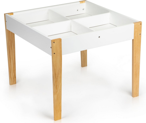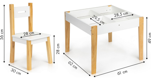 masivní borové nohy dvoudílná odnímatelná deska stolu s tabulí 4 přihrádky ve středu stolu ideální pro dětský pokoj nebo hernu jednoduchý design ve skandinávském stylu rozměry herního stolu: 62 x 61 x 49 cm rozměry židličky: 56,5 x 30 x 28 cm