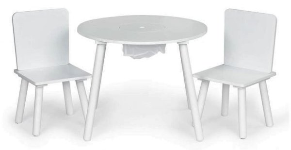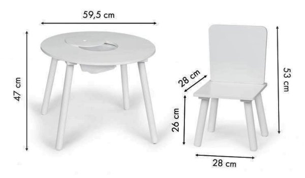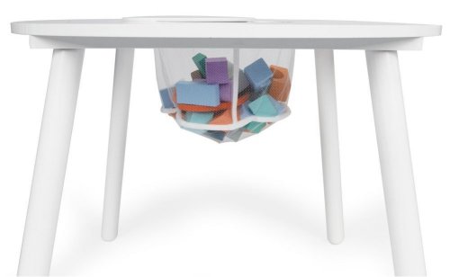 Rozměry stolu: 59,5 x 47 cm. Rozměry židličky: 53 x 28 x 28 cm. Velká kulatá deska stolu. Síťový úložný box na hračky. Ideální do dětského pokoje nebo herny. Jednoduchý design ve skandinávském stylu.