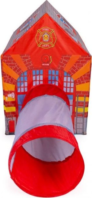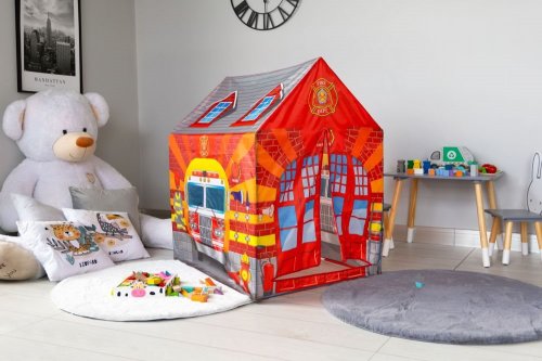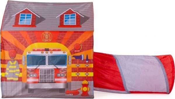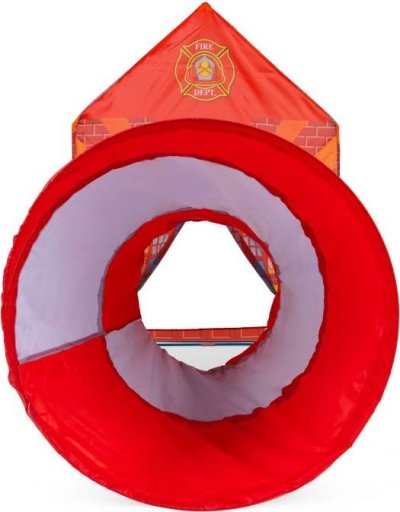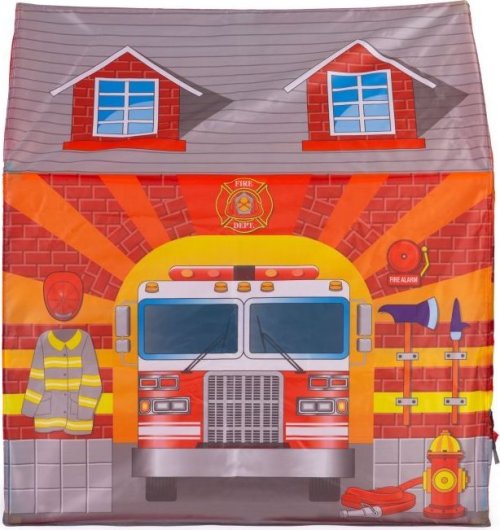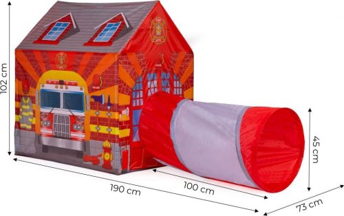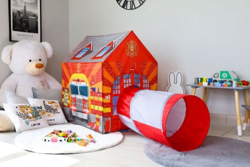 Dětský stan s tunelem s motivem hasičské stanice.