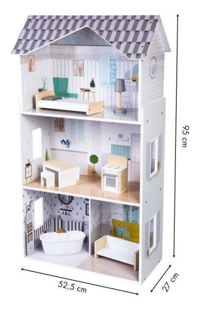 Rozměry domečku: 52,5 x 27 x 95 cm. Dřevěná, bezpečná konstrukce. 3 nezávislé úrovně, 4 různé místnosti. Rozvíjí představivost, kreativitu a manuální dovednosti.