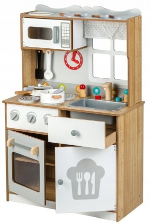 Dětská útulná kuchyňka od značky ECOTOYS je vhodná pro každého malého kuchaře nebo kuchařku! Kuchyňka je vyrobena z kvalitního dřeva. Součástí kuchyňky je sporák s 4 plotýnkami, trouba, mikrovlnná trouba, dřez s kohoutky odlišné podle barvy, úložný a odkládací prostor. Děti se mohou při vaření dívat z okna se záclonkou, které je součástí kuchyňky. Na stěně kuchyňky visí hodiny. Obsahuje doplňky jako je hrnec, pánev s pokličkou, příbory, 2 talíře, naběračka, obracečka, dózičky na pepř a sůl . Rozměry kuchyňky: 60 x 30 x 93,5 cm. Upozornění: Výrobek je dodáván v demontovaném stavu. Při sestavování postupujte dle přiloženého obrázkového návodu. Montáž smí provádět pouze dospělá osoba. K montáži je třeba šroubovák (není součástí balení).
