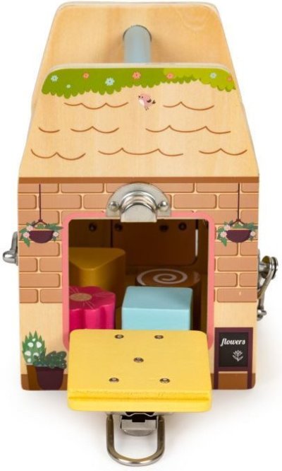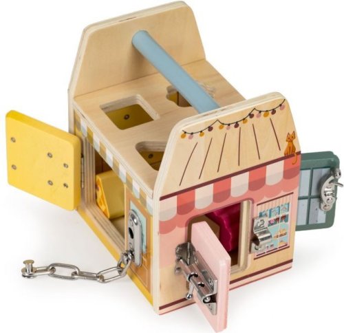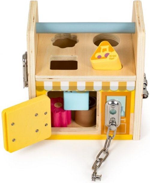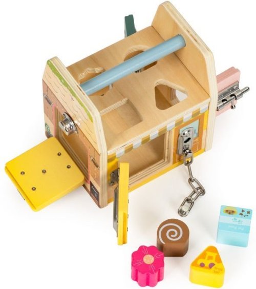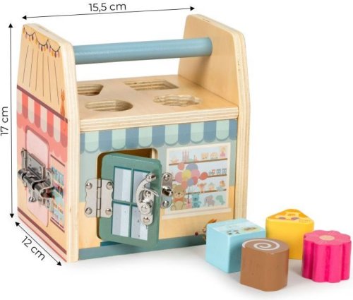 pevná a bezpečná dřevěná konstrukce stěny kostky jsou vybaveny různými zámky, díky kterým mohou děti rozvíjet své poznávací a motorické dovednosti v horní části kostky se nachází třídička kostek, která dítě naučí rozpoznávat barvy a tvary rukojeť umožňuje snadné přenášení rozměry: 15,5 x 17 cm