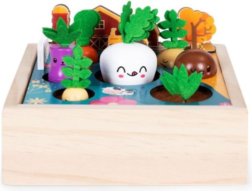 bezpečné dřevěné provedení, otevírací víko pro snadné skladování, součástí víka je panorama farmy, podpora manuální dovednosti a znalosti o zelenině.