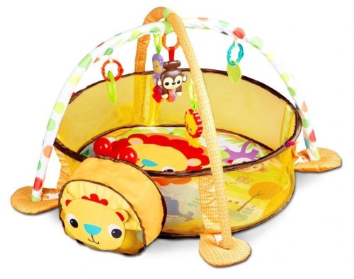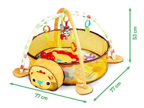 Vzdělávací hrací deka Lev zabaví vaše děťátko na dlouhé chvíle. Pestrobarevné provedení a výběr závěsných hraček výrazně stimulují smysly a motorické dovednosti. Díky svým kvalitám dále rozvíjí hmat, zrak, koordinaci a pohyblivost prstů. Výhody výrobku - vhodné pro děti od narození - látková ohrádka - dvě odnímatelné hrazdičky se čtyřmi hračkami (lze odejmout) - 30 barevných míčku s úložným prostorem - na dotek příjemný kvalitní materiál, možnost praní Parametry - rozměry 77 x 77 x 53 cm - průměr deky 68 cm - výška síťky ,ohrádky, 20 cm - váha 2,3 kg