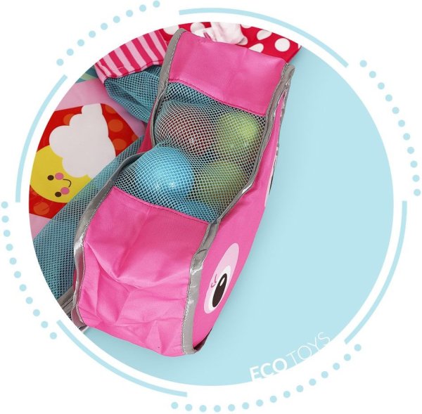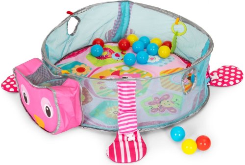 Vyrobena z bezpečných materiálů, různé textury, tvary a barvy přitahují pozornost a podporují rozvoj malého dítěte, rozvoj představivosti, motorických a manuálních dovedností, měkká, barevná konstrukce se zavěšenými hračkami (5 ks), 30 barevných míčků v sadě, úložný prostor na míčky v hlavě zvířátka, rozkládací boční síťka plnící funkci ohrádky, 3 způsoby používání: bazén s míčky, podložka se zavěšenými hračkami bez boční stěny či ohrádka.