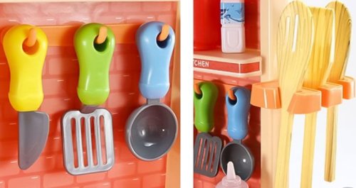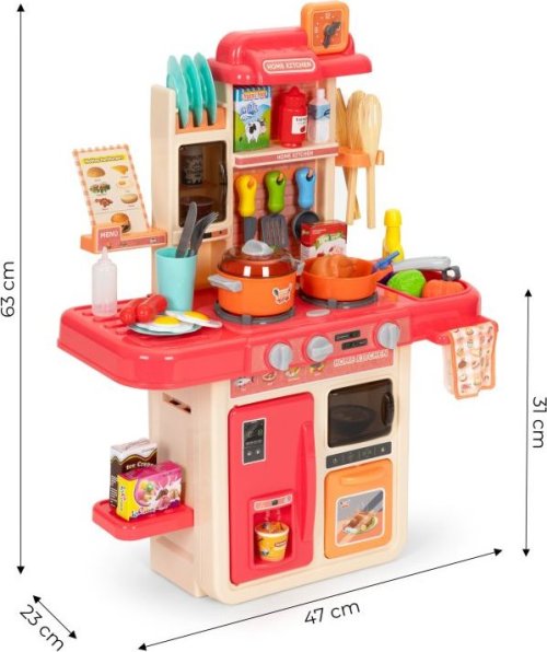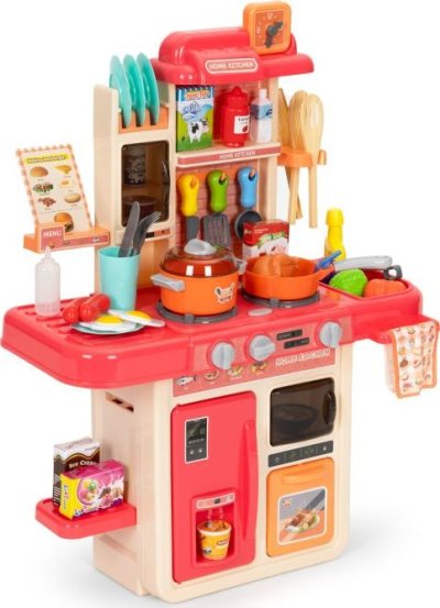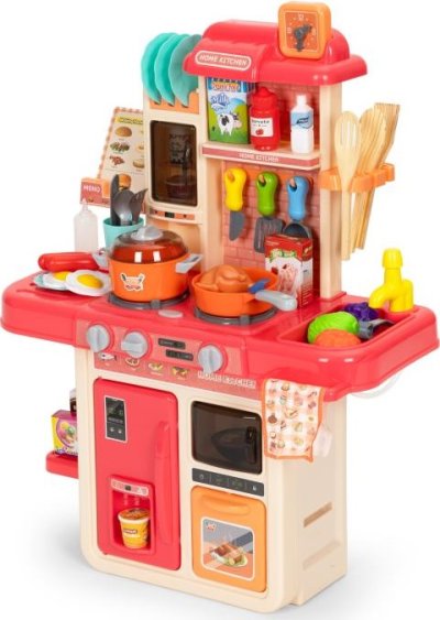 Zahrajeme si na kuchaře? Kuchyňka pro všechny malé kuchařky a kuchaře. Pozvěte si své kamarády a přichystejte jim nejrůznější dobrůtky. Po zapnutí hořáků vydávají kamna zvuk vařící vody a hořáky jsou navíc osvětleny červenými LED diodami. Skvělým doplňkem je vyvíječ páry - stačí naplnit jeden z hořáků vodou, položit na něj hrnec a po chvíli začne zpod pokličky vycházet pára. K dispozici je dřez, který lze naplnit vodou, jelikož z vodovodního kohoutku vytéká voda.