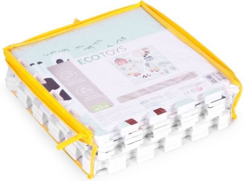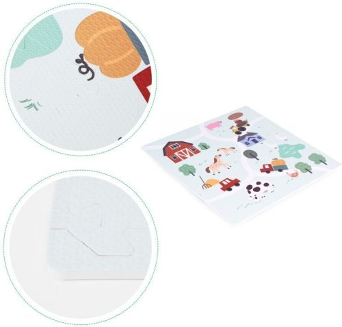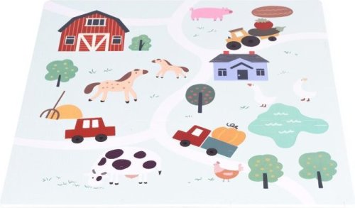 Pěnové puzzle s potiskem cestiček, zvířat a statku pro děti od 3 let. Balení obsahuje 9 čtvercových dílů a 12 okrajových dílků. Bezpečná a měkká podložka je omyvatelná, tlumí hluk a izoluje od chladu, je proto ideální jako hrací koberec nejen do dětských pokojů. Puzzle má vroubkovaný povrch s barevným potiskem. Tloušťka pěnového puzzle je 1 cm. Rozměr složeného puzzle 90,5 x 90,5 cm. Baleno v plastovém obalu s praktickým uchem pro pohodlné přenášení a zapínáním na zip.