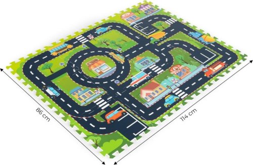Pěnové puzzle s potiskem městečka s jeho ulicemi pro děti od 12 měsíců. Balení obsahuje 12 čtvercových dílů. Bezpečná a měkká podložka je omyvatelná, tlumí hluk a izoluje od chladu, je proto ideální jako hrací koberec nejen do dětských pokojů.
