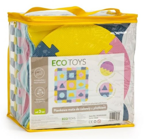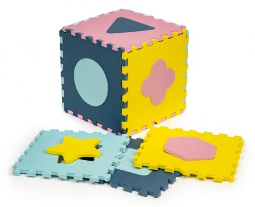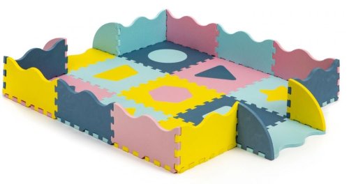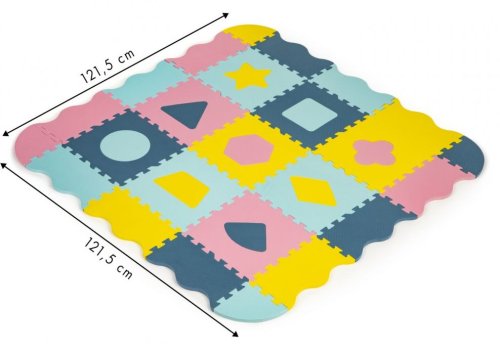Pěnové puzzle s dílky v pastelových barvách pro děti od 3 let. Koberec má vyjímatelné dílky s geometrickými tvary. Balení obsahuje 9 čtvercových dílků, 12 okrajových dílků a 4 rohové dílky. Bezpečná a měkká podložka je omyvatelná, tlumí hluk a izoluje od chladu, je proto ideální jako hrací koberec nejen do dětských pokojů.
