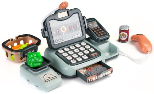 Zahrajeme si na obchod? Pojďte si k nám nakoupit! Pokladna má řadu funkcí, díky kterým bude zábava ještě návykovější. Dítě bude mít příležitost naučit se základy sčítání, odčítání a pravidla nakupování. Pokladna může skenovat produkty připojené k sadě, prodávat je a navíc můžete pomocí terminálu platit za nákupy kartou. Prodejci je k dispozici také pracovní mikrofon, pokladna má vestavěný reproduktor, díky kterému se přehrávají zvuky a melodie. Balení obsahuje: pokladna se skenerem, váha, peníze, košík a různé potravinářské výrobky. Baterie 3x AA jsou součástí výrobku. Vhodné pro děti od 3 let.