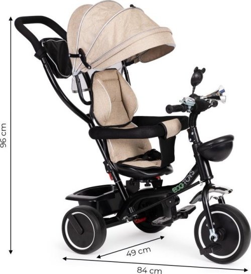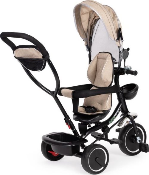 Bezpečná tříkolka s vodící tyčí a stříškou pro děti od 12 měsíců. Tříkolku lze používat jako vozík, kdy můžete dítě pouze tlačit pomocí vodící tyče. Nohy dítěte jsou přitom umístěny na bezpečnostních stupačkách. Výhody tříkolky: