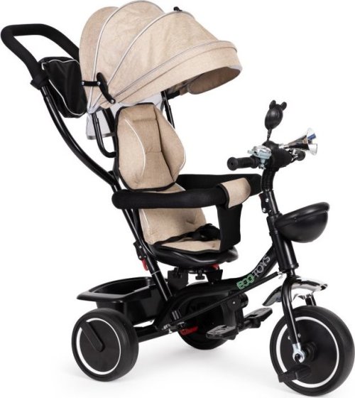 otočné sedadlo o 360° uzamknutí řídítek bezpečnostní brzda sklápěcí stříška a stupátka na nohy měkké polstrované sedadlo bezpečnostní pásy košík na řídítkách a na vodící tyči masivní, vyztužená konstrukce odolné pneumatiky