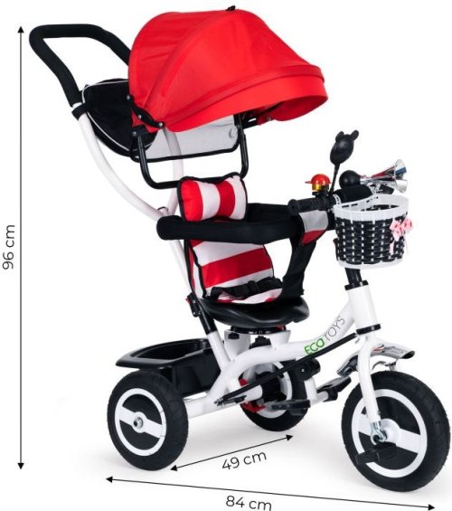délka tříkolky: 84 cm výška vodící tyče: 96 cm rozteč zadních kol: 49 cm průměr předního kola: cca 30 cm průměr zadních kol: cca 24 cm nosnost: 25 kg