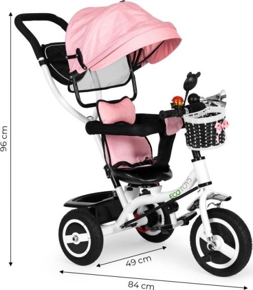 délka tříkolky 84 cm výška vodící tyče 96 cm rozteč zadních kol 49 cm přední kola 12'' (cca 30 cm) zadní kola 9,5'' (cca 24 cm)