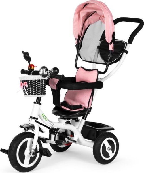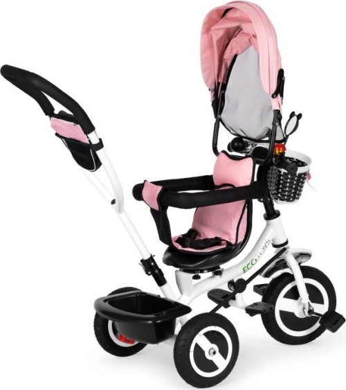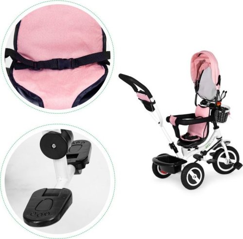 Bezpečná tříkolka s vodící tyčí a stříškou pro děti od 12 měsíců. Tříkolku lze používat jako vozík, kdy můžete dítě pouze tlačit pomocí vodící tyče. Nohy dítěte jsou přitom umístěny na bezpečnostních stupátkách. V závislosti na věku a samostatnosti vašeho dítěte můžete postupně odstranit jednotlivé bezpečnostní prvky, stříšku, zábrany, vodící tyč aj. Výhody tříkolky: