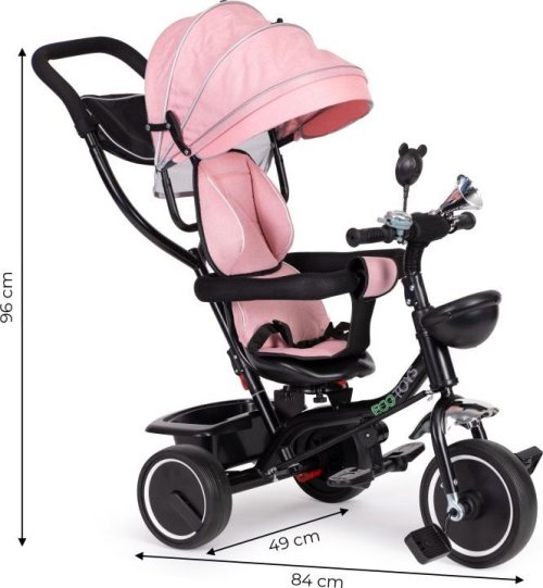 délka tříkolky: 84 cm výška vodící tyče: 96 cm rozteč zadních kol: 49 cm průměr předního kola: cca 30 cm průměr zadních kol: cca 24 cm nosnost: 25 kg