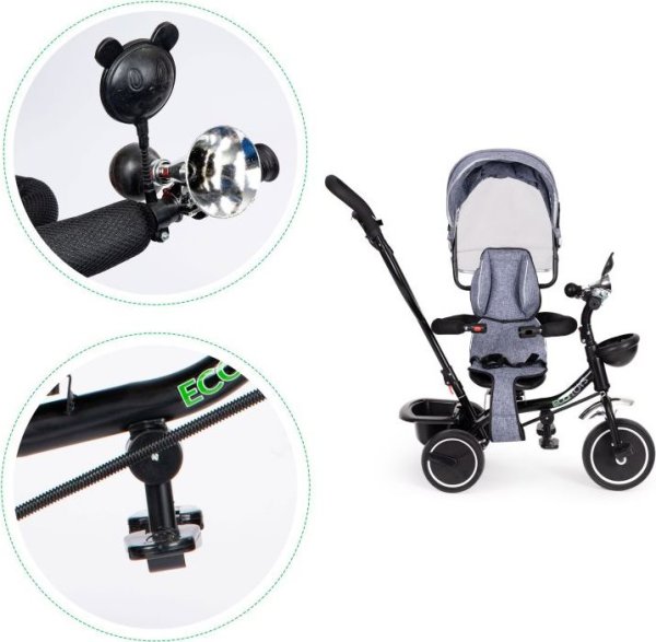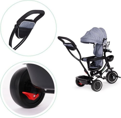 otočné sedadlo o 360° uzamknutí řídítek bezpečnostní brzda sklápěcí stříška a stupátka na nohy měkké polstrované sedadlo bezpečnostní pásy košík na řídítkách a na vodící tyči masivní, vyztužená konstrukce odolné pneumatiky