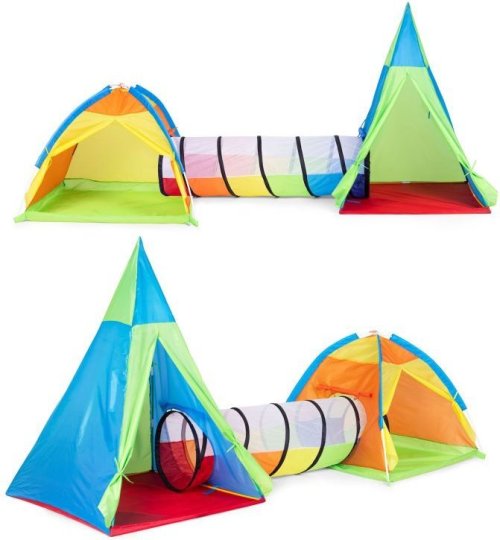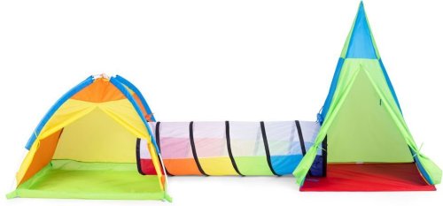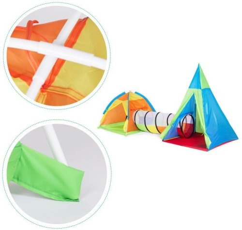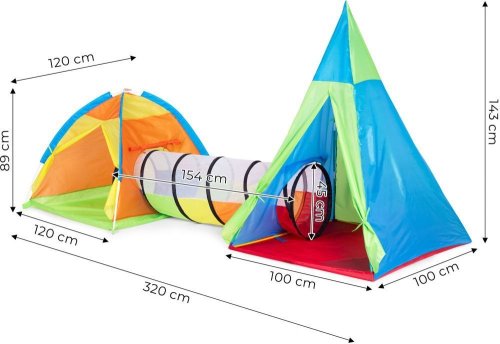 Dětský set se skládá ze dvou stanů (iglů a teepee) a spojovacího tunelu. Barevné stany mají dva vchody - jeden přední a jeden postranní pro nasunutí tunelu. Všechny části herní sestavy jdou od sebe oddělit. Stany mají plastový rám a podlahu s vodě-odolným efektem, jsou tak vhodný nejen do interiéru, ale můžete jej rozložit i na zahradě.