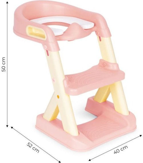 vhodné pro děti od 6 měsíců, vhodné pro všechny typy toalet, pohodlné a měkké sedátko s madly, žebřík se schůdky usnadní dětem výstup na toaletu, nastavitelná výška, protiskluzové schůdky, vyrobeno z odolného plastu, rozměry: 40 x 52 x 50 cm.