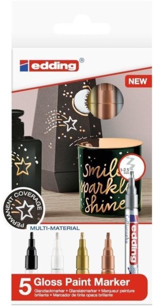 Kaligrafický popisovač EDDING 753 sada 5 ks v metalických barvách je určen pro permanentní ozdobné psaní a zdobení na hladkých, průhledných i tmavých materiálech, např. na skle, kovu, plastu a křídovém papíru. Má brilantní vysoce lesklé třpytivé metalické barvy. Barevný pigmentový inkoust je rychleschnoucí, extrémně odolný vůči světlu a odolný vůči rozmazání, opotřebení a povětrnostním vlivům. Ventilový systém umožňuje rovnoměrný tok inkoustu pro dokonalé pokrytí a neprůhlednost barvy. Je vybaven speciálním kaligrafickým hrotem, s nímž je možné tvořit od jemných až po široké tahy, s šířkou stopy v rozsahu od 1 do 2,5 mm. Snadné a čisté použití pro spontánní kreativu.