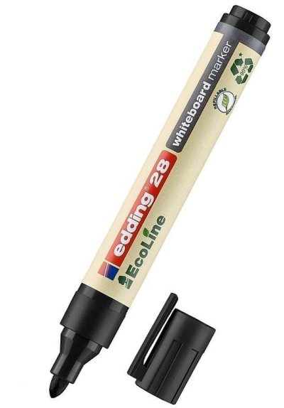 Popisovač na bílé tabule edding 28 z ekologické řady edding EcoLine má tělo vyrobené nejméně z 90 % z recyklovaných materiálů. Vyměnitelný hrot a možnost znovu naplnění vypsaného popisovače pomáhá snižovat množství odpadu, takže je šetrný k životnímu prostředí. Popisovač je vhodný na emailové a melaminové tabule i na flipcharty. Sytá stopa rychle zasychá a je zasucha stíratelná. Díky inkoustu "cap-off" vydrží popisovač bez víčka i několik dní, aniž by vyschl. Inkoust neobsahuje butylacetát. Víčko je opatřeno klipem, který zabrání skutálení popisovače z vodorovného povrchu. Popisovač je znovu naplnitelný (náhradní kapilární inkoust edding BTK 25 nebo kapací inkoust edding BT 30) a jeho hrot je vyměnitelný. Prodloužením životnosti popisovače pomůžete snížit množství komunálního odpadu. Klimaticky neutrální produkt podle ClimatePartner (ID 13742-1910-1001). Kulatý hrot. Šíře stopy: 1,5-3 mm. Vyrobeno v Německu.