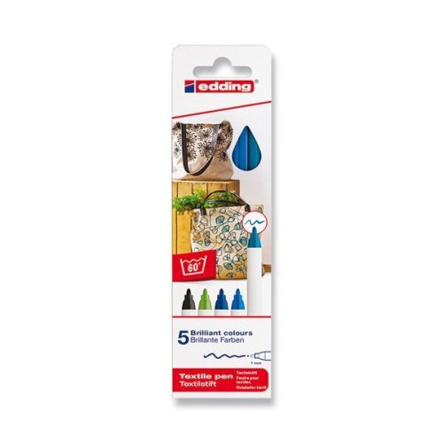 Popisovač na textil EDDING 4600, sada 5 ks, studených barev. Permanentní textilní popisovač vhodný pro psaní a malování na trička, povlaky na polštáře, látkové pytlíky nebo látkou potažené krabice. Vybrat si můžete z široké škály barev. Barvy jsou dostupné jednotlivě nebo v sadě. Vhodný pro psaní, kreslení a zdobení většiny světlých hladkých textilií, jako je bavlna, hedvábí a len. Inkoust na vodní bázi má neutrální vůni, je rychleschnoucí a extrémně světlostálý. Popisovač má kulatý hrot s šířkou stopy 1 mm.