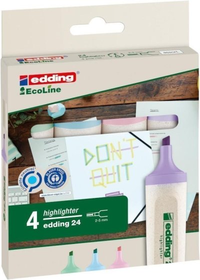 Zvýrazňovač EDDING 24 EcoLine, sada 4 ks, pastel. Permanentní ekologické fixy z řady Ecoline pro značení téměř všech materiálů, např. papíru, kartonu, kovu, dřeva, plastu a skla. Nejméně 90 % celkového plastu použitého v popisovači je vyrobeno z recyklovaného materiálu. Je vybaven kulatým hrotem o šířce stopy 1,5-3 mm. Rezistentní vůči vodě, světlostálý, rychleschnoucí, s nízkým zápachem, bez přidaného toluenu / xylenu. Odolný vůči otěru a opotřebení. Tento produkt lze znovu naplnit Edding MTK 25 a Edding T 25, Edding T 100 a Edding T 1000. Vyměnitelné hroty (EDDING 21N) prodlužují dobu použití popisovače.