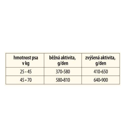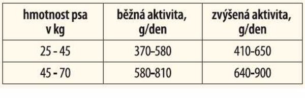 Doporučená denní krmná dávka je pouze orientační, je nutno ji přizpůsobit potřebám konkrétního pejska, jeho temperamentu a fyzické aktivitě.