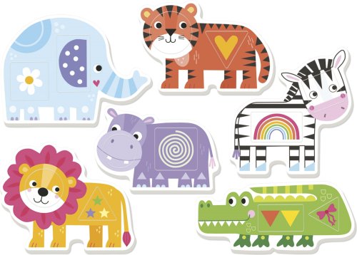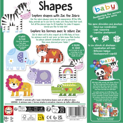 Hra na poznávání geometrických tvarů. Porovnávejte tvary, velikosti a naučte se rozpoznávat a rozlišovat základní geometrické tvary: čtverec, trojúhelník, kruh, obdélník. Rozvíjí pozornost, jemnou motoriku, zvídavost a představivost. Obsahuje 6 zvířátek se 2 základními propojenými tvary. Velké a silné dílky pro snadnější držení. Učení formou hry.