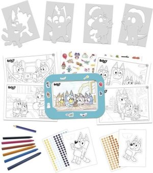 1 plastový rámeček, 24 listů k vybarvení, samolepky, 2 kartonové panely s figurkami, 2 listy samolepek, 6 pastelek + 1 tužka, 4 kartonové šablony s postavami.