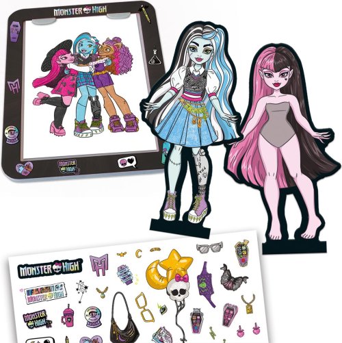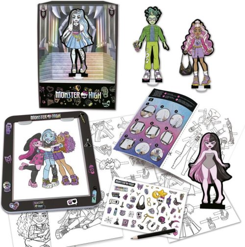 4 figurky Monster High, 1 svítící podložka, 4 podstavce na figurky, 1 tužka, 1 arch samolepek, 32stránková brožura s obkreslovacím obsahem, 1 scéna, návod.